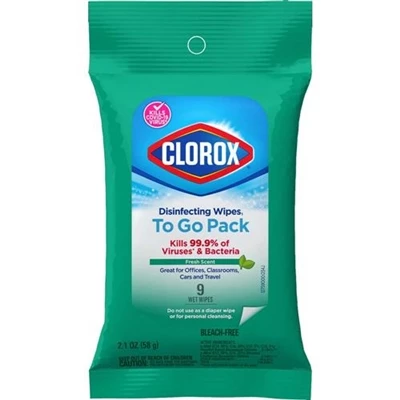 Clorox Disinfecting Wipes To Go Pack Fresh Scent 9 Wet Wipes 2.1oz / 58g Clorox Disinfecting Wipes are triple layered to clean, disinfect and remove allergens for 5x cleaning power and leave a clean Fresh scent