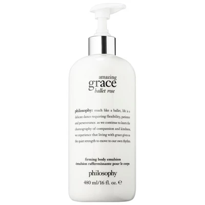 Philosophy Amazing Grace Ballet Rose Firming Body Emulsion 16oz / 480ml An emulsion that softens and smooths skin with the dreamy and ethereal scent of Amazing Grace Ballet Rose. Â Introducing Amazing Grace Ballet Rose, inspired by the delicate scent of pink rose petals opening at first bloom and the beautiful femininity of the bestselling Amazing Grace fragrance. This captivating new scent captures the quiet strength of a ballerina in a heart of delicate rose and peony, which are layered with sparkling lychee and finished with woods and sheer ballet pink musk.