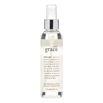 Philosophy Pure Grace Satin Finish Body Oil Mist 5.8 oz / 174ml is enriched with natural oils to moisturize and condition for luxuriously soft, lightly scented skin.