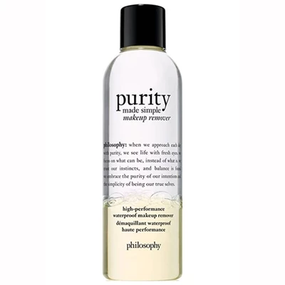 Philosophy Purity Made Simple HighPerformance Waterproof Makeup Remover 6.6oz / 195ml A pure, clean sweep! Purity Made Simple highperformance Makeup Remover clears the day away, including stubborn longwear and waterproof makeup without tugging, pulling or drying. Safe for eye makeup removal and contact lens wearers, Philosophys gentle yet powerful formula with cornflower and chamomile extracts removes all traces of makeup, leaving skin feeling soothed, refreshed and conditioned.