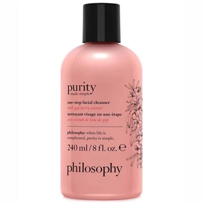 Philosophy Purity Made Simple One Step Facial Cleanser With Goji Berry Extract 8oz / 240ml It melts away dirt, oil and makeup while toning and lightly hydrating skin in one simple step. Gentle enough for even the sensitive eye area, this cleanser deep cleans yours pores and helps condition skin. The cleanser is charcoal powder, also known as activated charcoal, its derived from hardwood and known for its detoxifying properties and ability to absorb oil and serum.